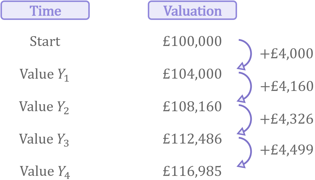\begin{aligned}\text{Value}\ Y_{4}&=\text{Value}\ Y_{3}\times 1.04 \\[12pt]&=(((\text{Original price}\times 1.04)\times 1.04)\times 1.04)\times 1.04 \\[12pt]&=£116,985\end{aligned}
