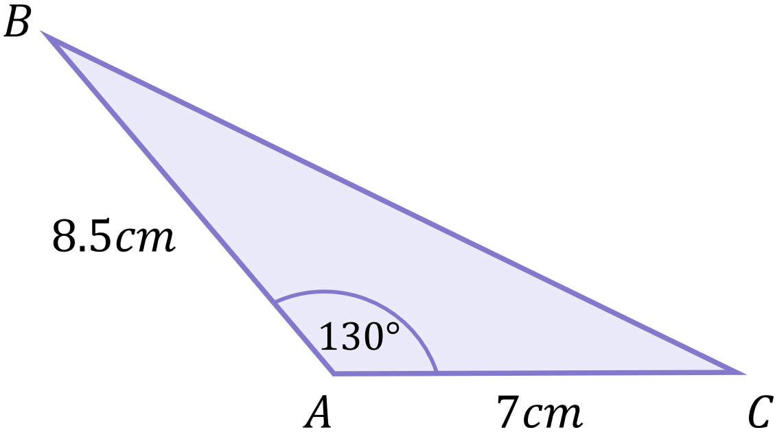 \begin{aligned}a^{2}&=(7)^{2}+(8.5)^{2}-2(7)(8.5)\cos{130} \\[12pt]a^{2}&=121.25-119\cos{130} \\[12pt]a^{2}&=121.25-119(-0.643) \\[12pt]a^{2}&=121.25+76.49 \\[12pt]a^{2}&=197.74 \\[12pt]a&=\sqrt{197.74} \\[12pt]a&=14.1cm\end{aligned}