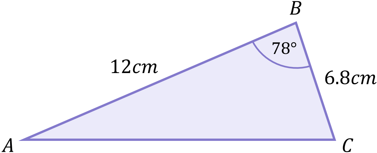 \begin{aligned}b^{2}&=(6.8)^{2}+(12)^{2}-2(6.8)(12)\cos{78} \\[12pt]b^{2}&=46.24+144-163.2\cos{78} \\[12pt]b^{2}&=190.24-163.2(0.208) \\[12pt]b^{2}&=190.24-33.93 \\[12pt]b^{2}&=156.31 \\[12pt]b&=\sqrt{156.31} \\[12pt]b&=12.5cm\end{aligned}